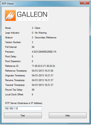 Welcome to the Free Galleon NTP server checker. This software is a test tool that acts as a client to a NTP server. The Galleon SNTP client reports on the responses it receives and allows you to check the accuracy and precision of a NTP time server. You can specify how many requests to send and how large the time between each. The SNTP server checker is easy to use and can test the accuracy and reliability of any NTP server.